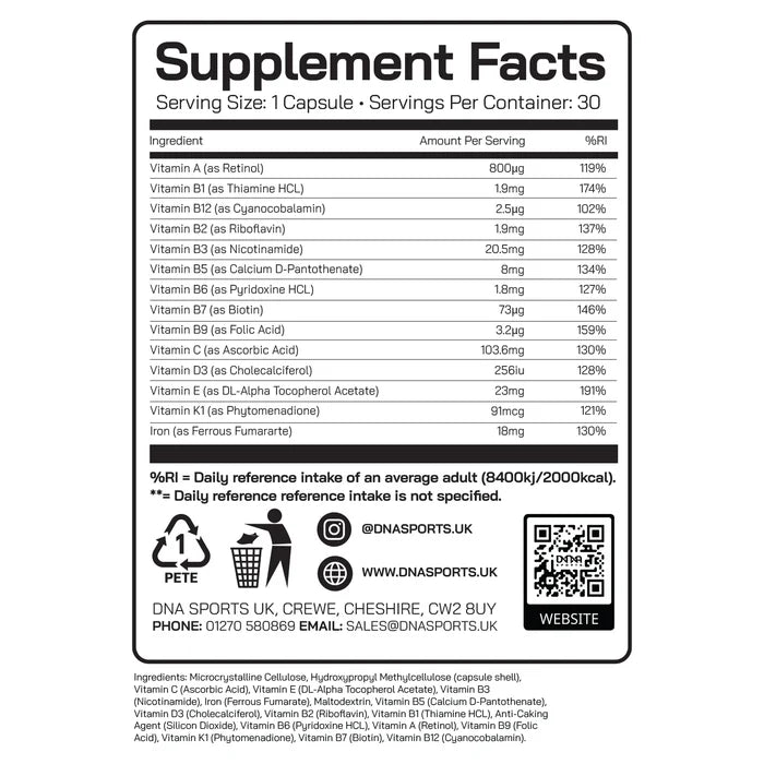 DNA Sports™ MultiVit is an all-in-one multivitamin formula designed to bridge nutritional gaps and keep your body performing at its best. Packed with a carefully selected blend of vitamins, minerals, and antioxidants, MultiVit helps support immune health, energy levels, muscle function, and overall well-being—making it an essential addition to any active lifestyle.